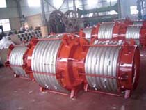 該膨脹節(jié)的二端各有一個(gè)工作波紋管,中間有一個(gè)平衡波紋管,膨脹節(jié)通過(guò)受力構(gòu)件(大拉桿或舌管)來(lái)承受內(nèi)壓推力,因此管系只需中間固定支架。該膨脹節(jié)只能吸收軸向位移。