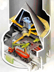 IBAU均化庫采用德國漢堡公司的連續(xù)均化技術。在外部帶一攪拌倉,庫底中心設一大圓錐,庫內生料的重量通過該錐傳遞給庫壁,庫底環(huán)形空間被分成向中心傾斜10度的6個充氣區(qū),每區(qū)裝設3種規(guī)格的6個充氣箱。充氣卸料時生料先被送至一條徑向布置的充氣箱上,再經過錐體下部的出料口由空氣斜槽送入庫底中央4000mm計量倉中。卸料時,生料在自上而下的流動過程中,切割水平料層而產生重力混合 作用,進入攪拌倉后又連續(xù)充氣攪拌而得到進一步均化,均化效果H可達6~8,電耗0.1~0.2Kwh/t生料。
