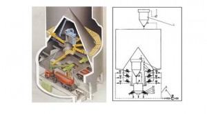 IBAU庫采用德國漢堡公司的連續(xù)均化技術(shù)。在外部帶一攪拌倉,庫底中心設(shè)一大圓錐,庫內(nèi)生料的重量通過該錐傳遞給庫壁,庫底環(huán)形空間被分成向中心傾斜10度的6個充氣區(qū),每區(qū)裝設(shè)3種規(guī)格的6個充氣箱。充氣卸料時生料先被送至一條徑向布置的充氣箱上,再經(jīng)過錐體下部的出料口由空氣斜槽送入庫底中央4000mm計量倉中。卸料時,生料在自上而下的流動過程中,切割水平料層而產(chǎn)生重力混合 作用,進(jìn)入攪拌倉后又連續(xù)充氣攪拌而得到進(jìn)一步均化,均化效果H可達(dá)6~8,電耗0.1~0.2Kwh/t生料。
